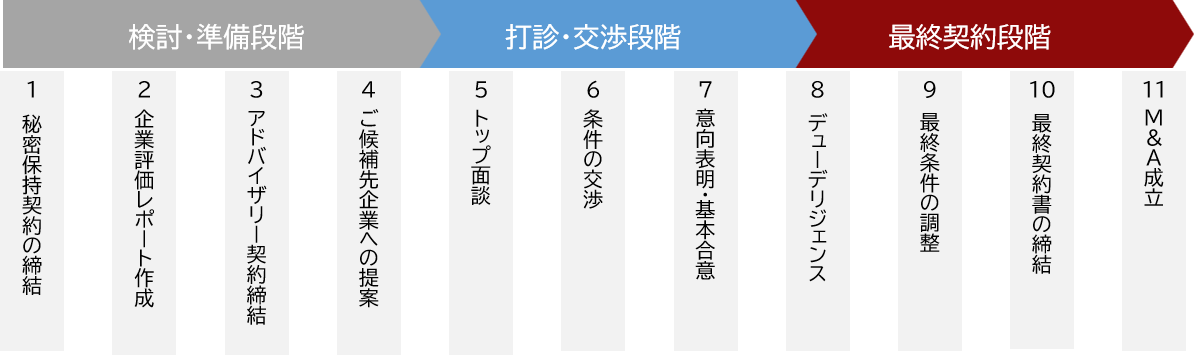 M&A成立までの流れは、「検討・準備段階」「打診・交渉段階」「最終段階」に分かれる。「検討・準備段階」の流れは下記の通りである。