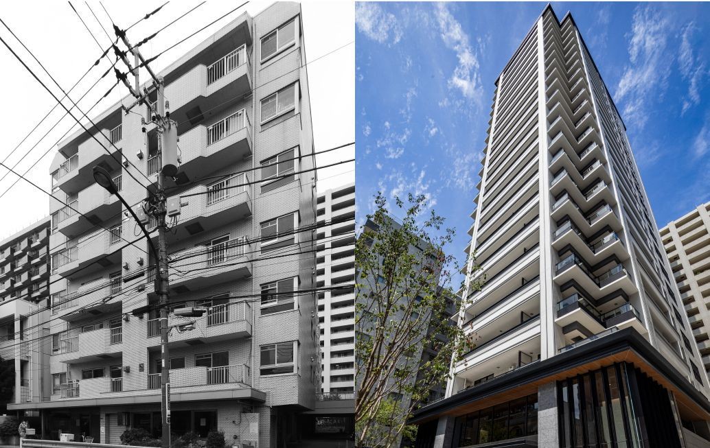 ▲23年に建て替えが完了した「日興パレス白金」(写真左が従前、右が建て替え後)では、従前の自己居住率が38%だった