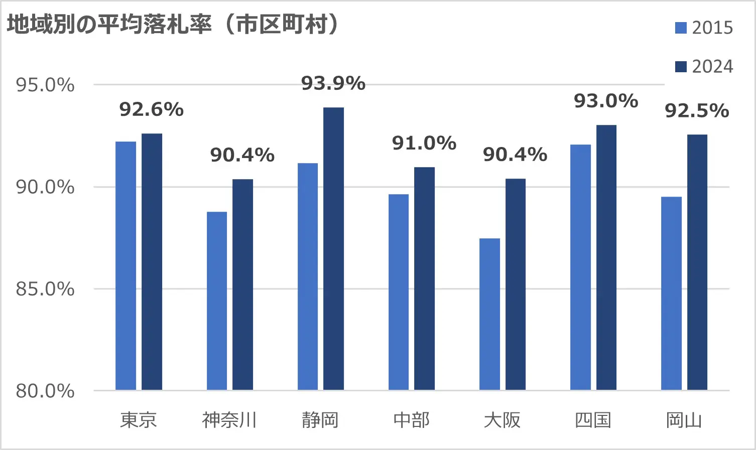 一方、落札率が最も高かったのは静岡県で、県が95・0%、市町村が93・9%。参加者数は県が平均7・7者、市町村が6・7者と少なく、ここ10年で見ても緩やかに減少している。