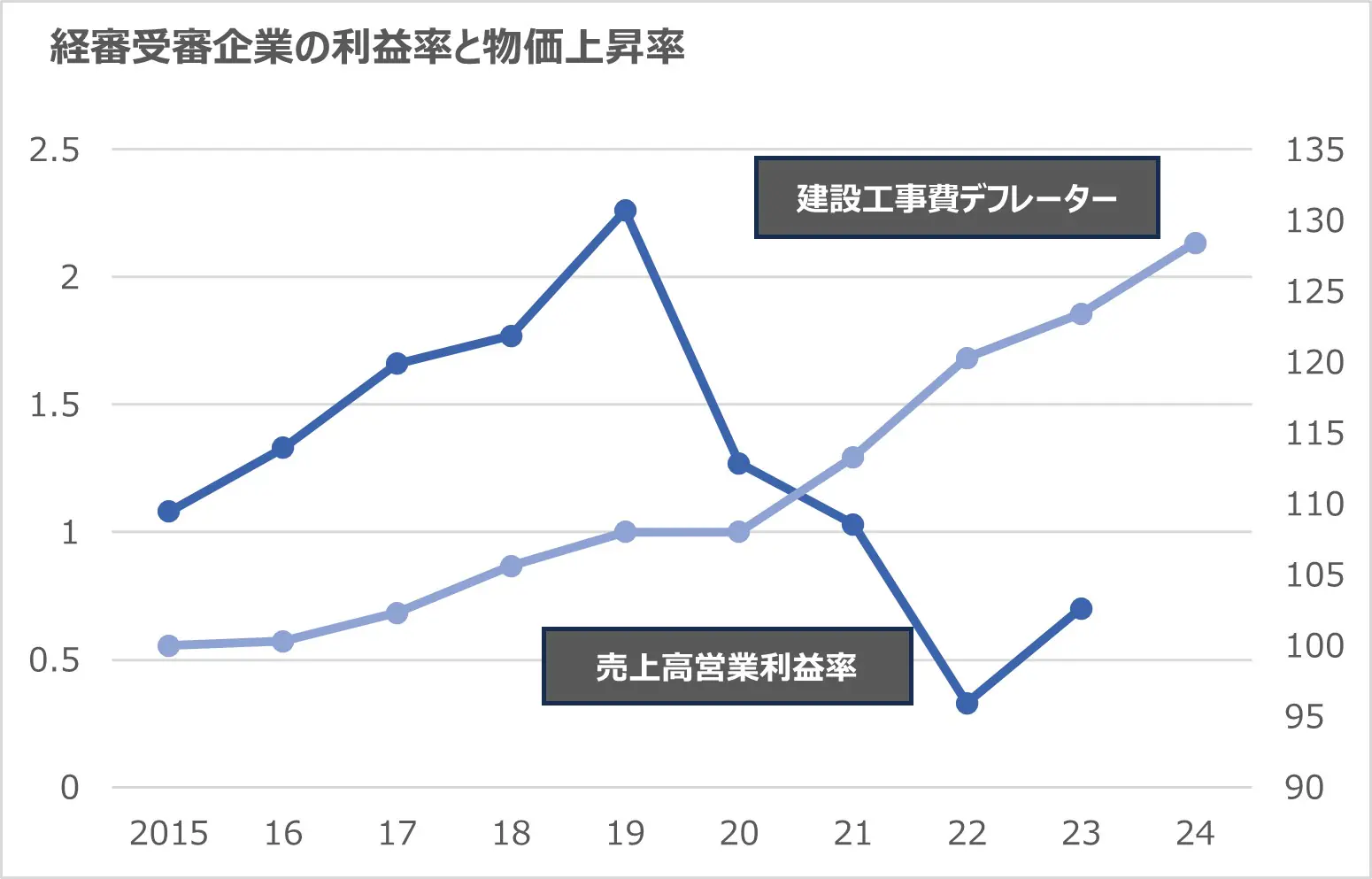 物価上昇は、公共工事を受注する企業の利益を圧迫している。建設業情報管理センター(CIIC)のまとめによると、経営事項審査の受審企業の売上高営業利益率は15年度に1・08%だったが、19年度までに2・26%まで上昇。ただ、20年度以降は低下傾向に入り、23年度には0・70%と1%を切った。スライド条項を活用した契約変更も一部の発注者では十分ではなく、予算と落札率が横ばいの傾向にある中で、受注者は適正な利益を確保できていない。