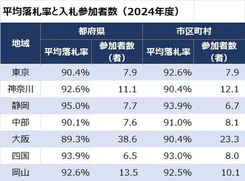 24年度に最も参加者が多かったのは大阪府で、1件あたりの平均が38・6者と他地域を大きく上回っている。10年前の15年度と比べると、平均の参加者数は1・8倍に増加している。府内の市町村も平均23・3者と入札参加者も他地域と比べて突出して多い。落札率は府で89・3%、市町村で90・4%といずれも他地域よりも低い水準だった。