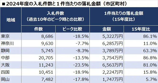 入札件数の減少とともに、1件当たりの落札金額も年々大型化している。15年度と比べて伸び率が最も高かったのは中部(愛知県、岐阜県、三重県)の86・8%増で、東京都の86・1%増、大阪府の81・0%増と、三大都市圏で特にこうした傾向が強い。