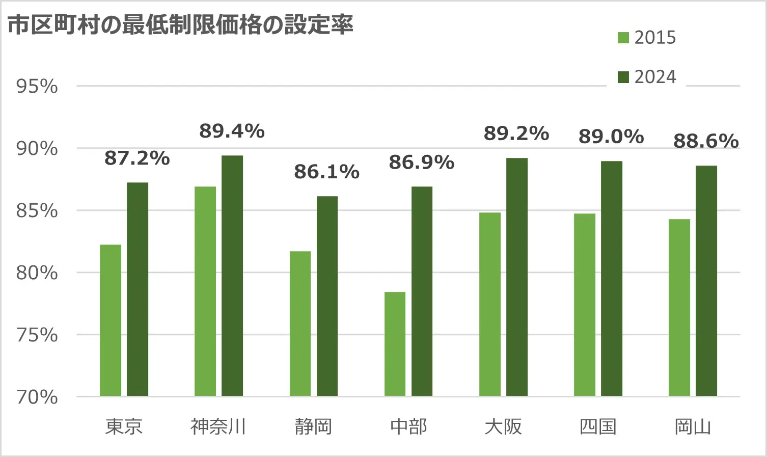 平均落札率は全てのエリアで緩やかな上昇傾向にある=グラフ「地域別の平均落札率(市区町村)」。10年前の15年度の時点で、2000年代に全国的に増加していた著しく低い価格での応札はすでに減少に転じており、最低制限価格や低入札価格調査基準価格などの制度は一部の市町村を除いて整っている。地域差はあるものの、全ての地域で平均落札率は90%を超えている。