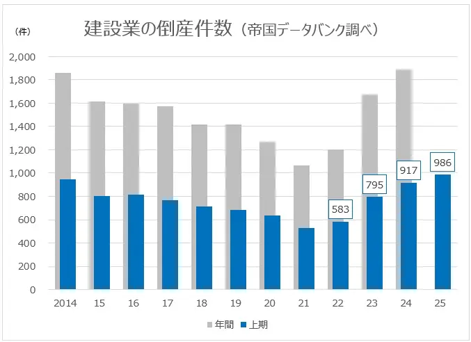 帝国データバンクのまとめによると、2025年上半期に発生した建設業の倒産は過去10年間で最多の986件となった。コロナ禍の政府の金融支援で倒産が大きく減った21年以降、増加は4年連続だ。資材価格の高騰と技能者の高齢化、人手不足に起因する倒産も目立つ。これまでにない競争環境の変化が、建設企業の経営に変革を迫っている。