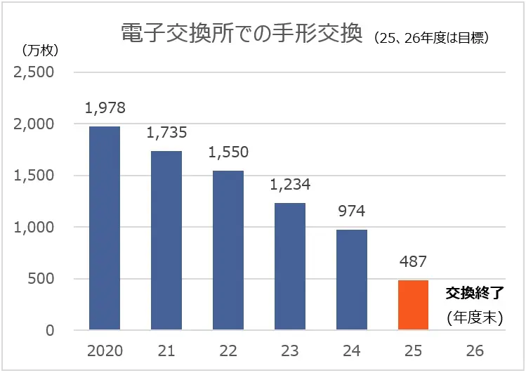 一方、政府は決済手段の近代化に向け、21年の成長戦略で手形の廃止を表明。これを受け、全銀協も手形廃止に取り組むとともに、26年度末から電子交換所での手形交換の終了を打ち出した。