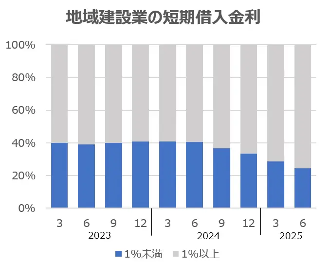 デフレの環境下で、建設企業の借入金利は低い水準に抑えられてきた。しかし、東日本・西日本・北海道建設業保証の3社がまとめた地元建設業の景況調査では、24年の下期を境に短期借入金利が「1%未満」と回答した企業は急減している=グラフ。