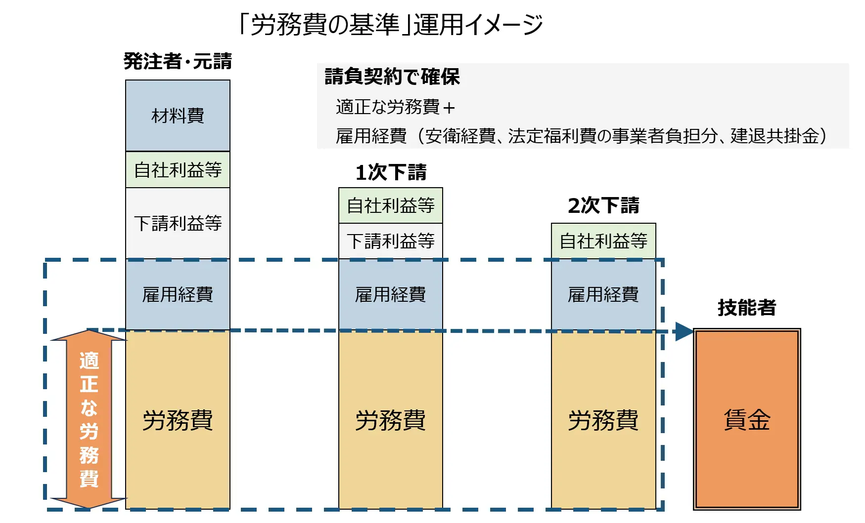 このとき、受注者は下請けの施工分を含めて、基準に基づき必要な労務費額を見積もることが求められる。設計変更などがない限り、自身の見積額での施工に責任を負うことになる。