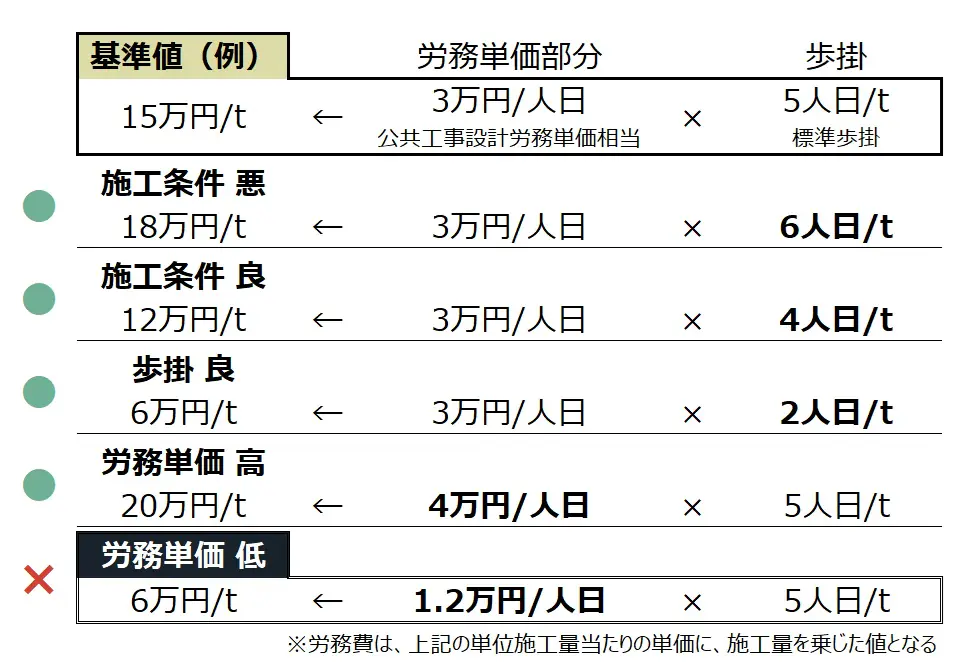 注文者が受注者と価格交渉する中で、減額交渉に合わせて生産性を向上させるための提案を行うことも否定されない。この提案は、「労務単価×歩掛」で構成する労務費のうち歩掛部分の改善に関するものである必要がある。