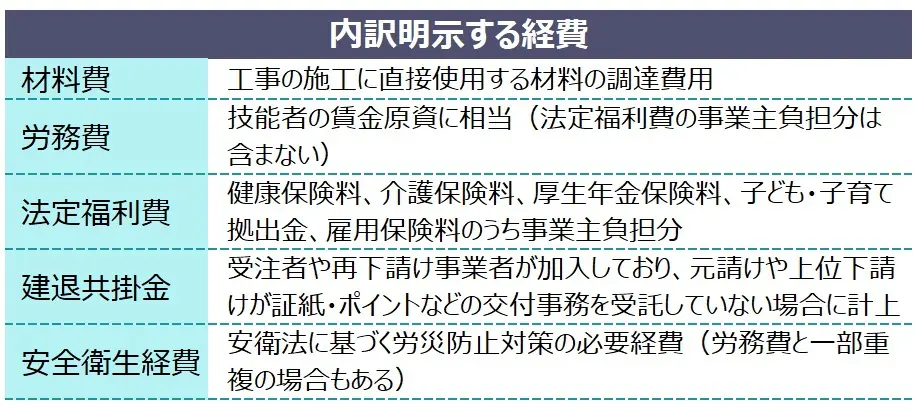 見積書に内訳明示するのは、材料費と労務費だけではない。これまで国交省が専門工事業団体とともに確保に取り組んできた法定福利費(事業主負担分)と安全衛生経費、建設業退職金共済制度の掛金を、適正な施工の確保に「不可欠な経費」として法的に位置付けた。こうした経費についても、通常必要な額を著しく下回る見積もり、見積もり依頼は禁止される。