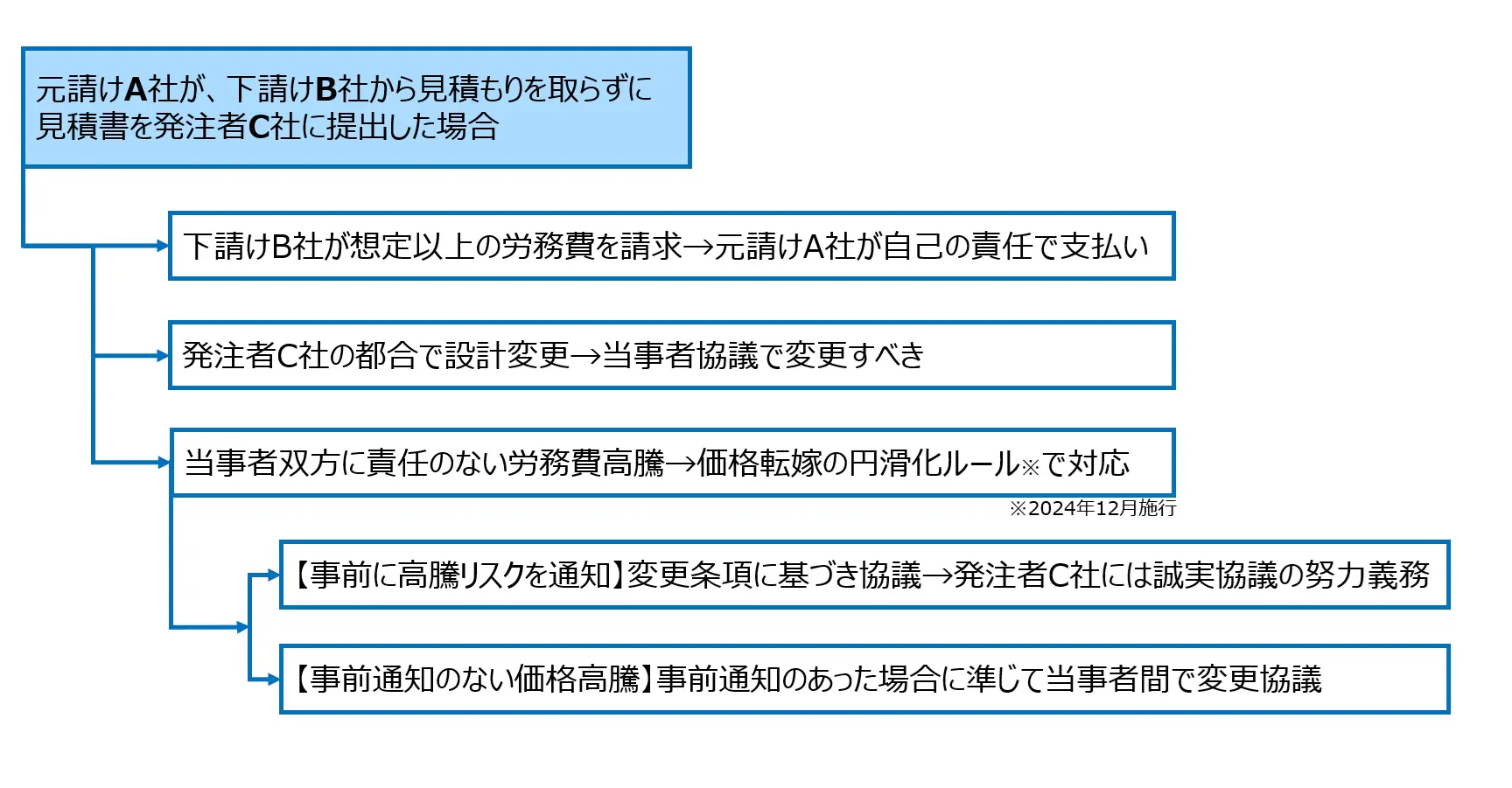 ただし、基準を踏まえた見積もりによる契約でも、注文者の都合で設計変更や見積もり条件の見直しが行われた場合は、当事者協議で請負代金額も変更すべきとされる。また、契約当事者の双方に責任のない労務費の変動については、2024年12月に施行された価格転嫁の円滑化ルールに沿った変更協議が可能だ。
