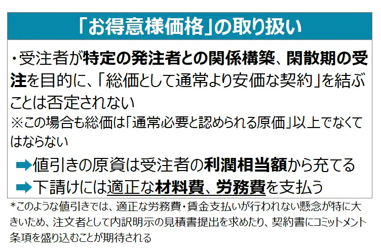 「労務費の基準」に基づく取引ルールが始まった今も、閑散期の稼動率を維持するための値引きや、いわゆる「お得意様価格」による安価な見積もりができなくなったわけではない。ただ、基準を著しく下回るような労務費や、総価での原価割れ契約が禁止される以上、値引きの原資には受注者の利潤相当額を充てなくてはならない。ただし、下請けに対しては適正な労務費・材料費などを支払うことが求められ、これを守らなければ法違反となる恐れがある。