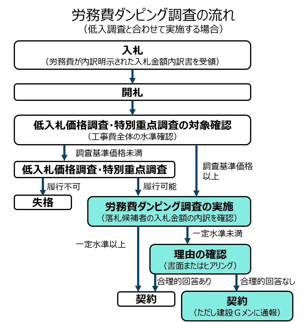 さらに、確認する工事費の範囲を労務費を含む直接工事費に絞った「労務費ダンピング調査」を新設した。低入札価格調査制度や最低制限価格制度を導入している発注機関は、失格しなかった落札候補者に労務費ダンピング調査を実施する。未導入の団体には予定価格以下の最低価格で応札した落札候補者に労務費ダンピング調査を実施するよう求めている。