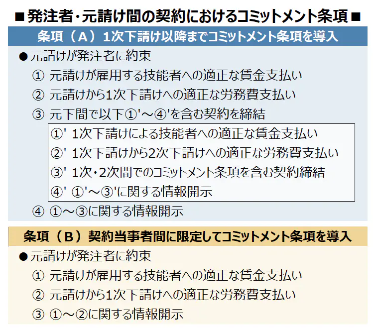 コミットメント条項には、AとBの2パターンの条文を設けた。共通の内容として、受注者が注文者(発注者、元請け、上位下請け)に対し▽直接雇用する技能者への適正な賃金支払い▽下請けへの適正な労務費支払い▽注文者の求めに応じ、支払い状況に関する書類を提出―を約束。労務費を末端の技能者にまで賃金として行き渡らせることを担保する。