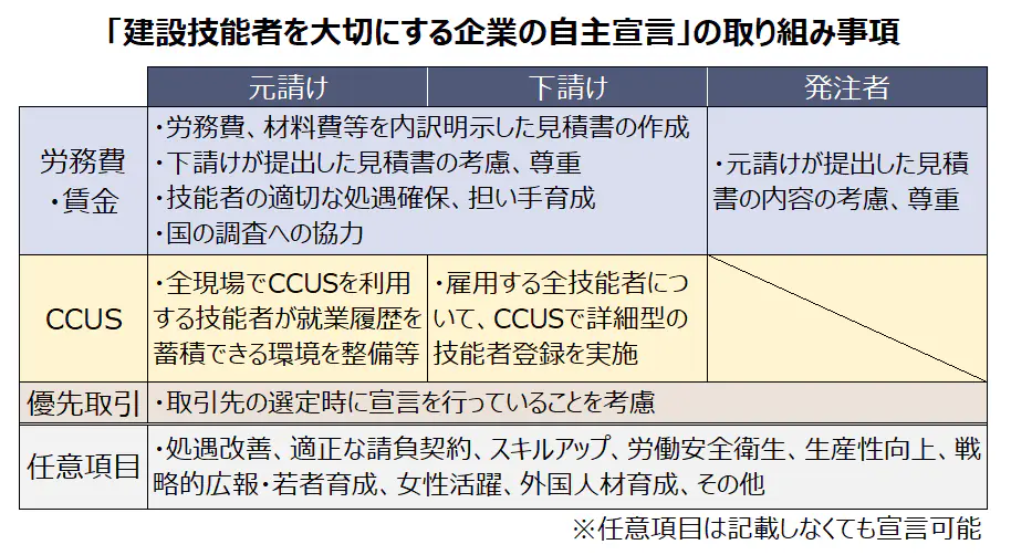 宣言企業となるには、元請け・下請け・発注者に共通の必須項目として、▽労務費・材料費等を内訳明示した見積書の作成▽下請けから提出された見積書の考慮・尊重▽宣言企業との優先取引―などが求められる。さらに、元請け・下請けのそれぞれに対し、建設キャリアアップシステム(CCUS)の利用環境整備に向けた要件が課される。