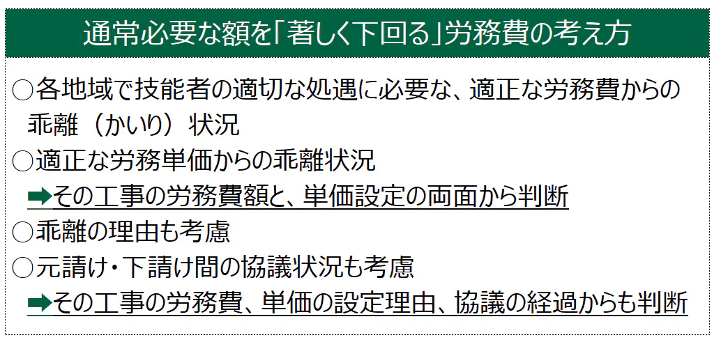 建設業法令順守ガイドラインを見ると、労務費が通常必要な額を著しく下回っているかどうか判断する際の考え方が示されている。地域性や工事内容を踏まえて技能者の処遇に必要な労務費、労務単価と実際の見積額の乖離(かいり)の程度や、乖離の理由、元請けと下請けの協議状況などが判断のポイントになる。最低賃金を下回るような低い額については、「著しい乖離状況と当然判断される」とした。