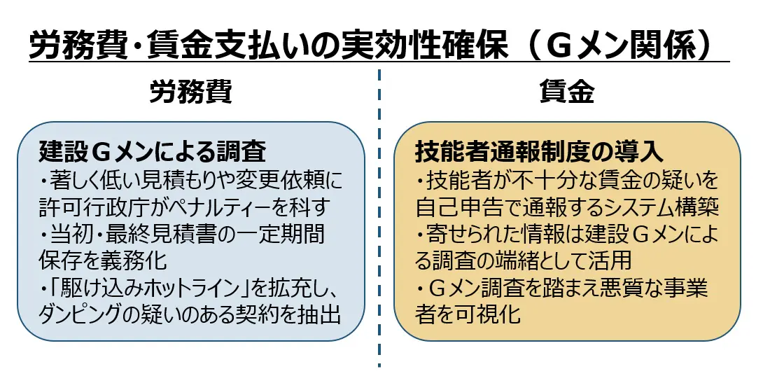 基準を守って適正な労務費を見積もっても、他の建設業者がダンピングをやめなければ「正直者が馬鹿を見る」との不安も建設業界には根強い。このため、国交省は、建設Gメンによる監視・指導の強化や、技能者賃金の通報制度の整備、技能者の処遇確保に前向きな企業の可視化など多岐にわたる実効性確保策を講じる。